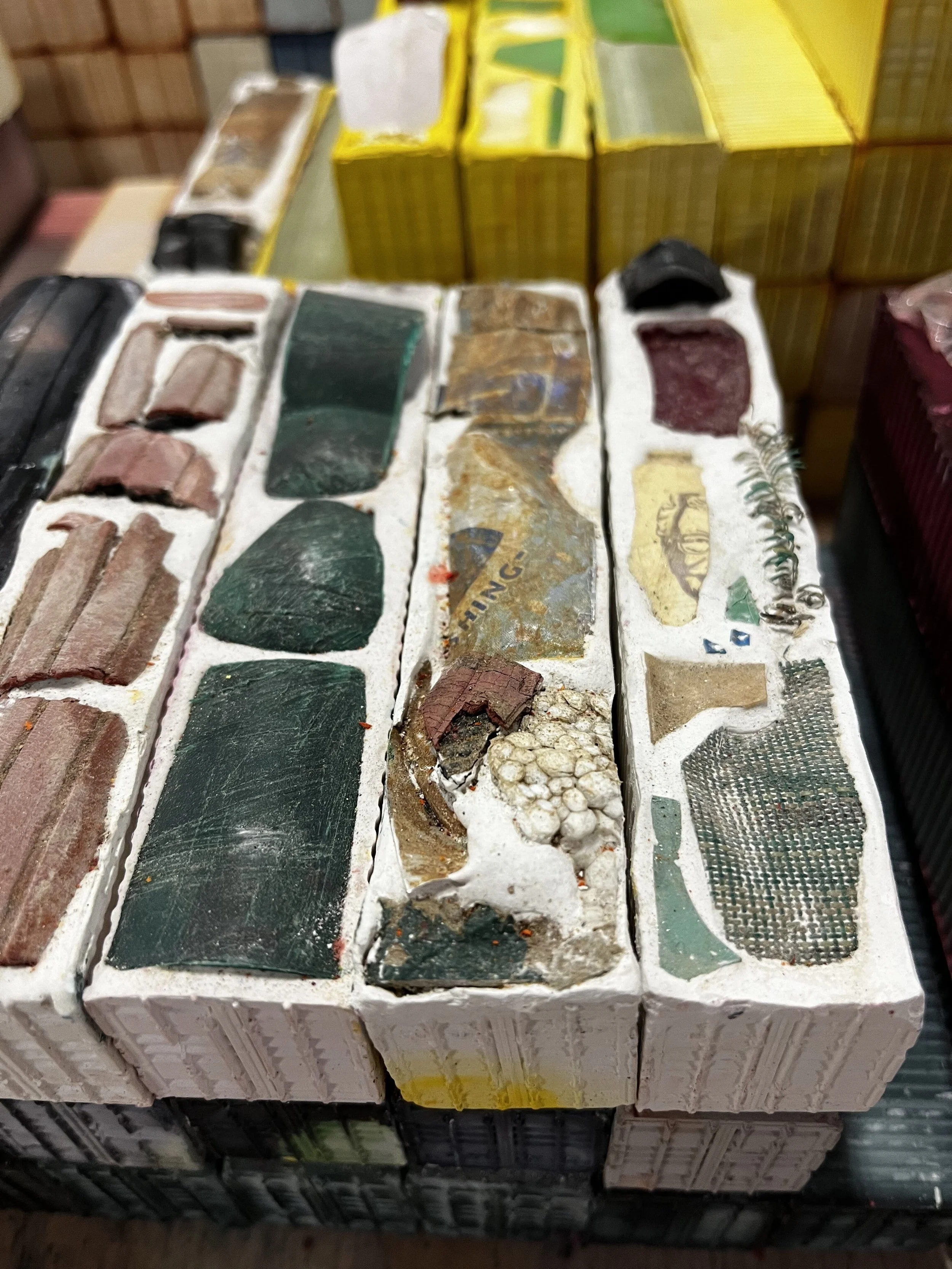 In August 2021, a flash flood devasted the horse farm I was a hand on. As we worked to clear and clean up the property (after emergency evacuating all animals) I collected plastics and other manmade detritus that came from upriver. It was once recommended to discard your household appliances and garbage into ravines and rivers in Appalachia, and the flood unearthed decades of this history. This trash, inset into many of the 1,382 HO scale (model train size) shipping containers I cast over a year, reflects the estimated number of shipping containers that fall into the sea annually.